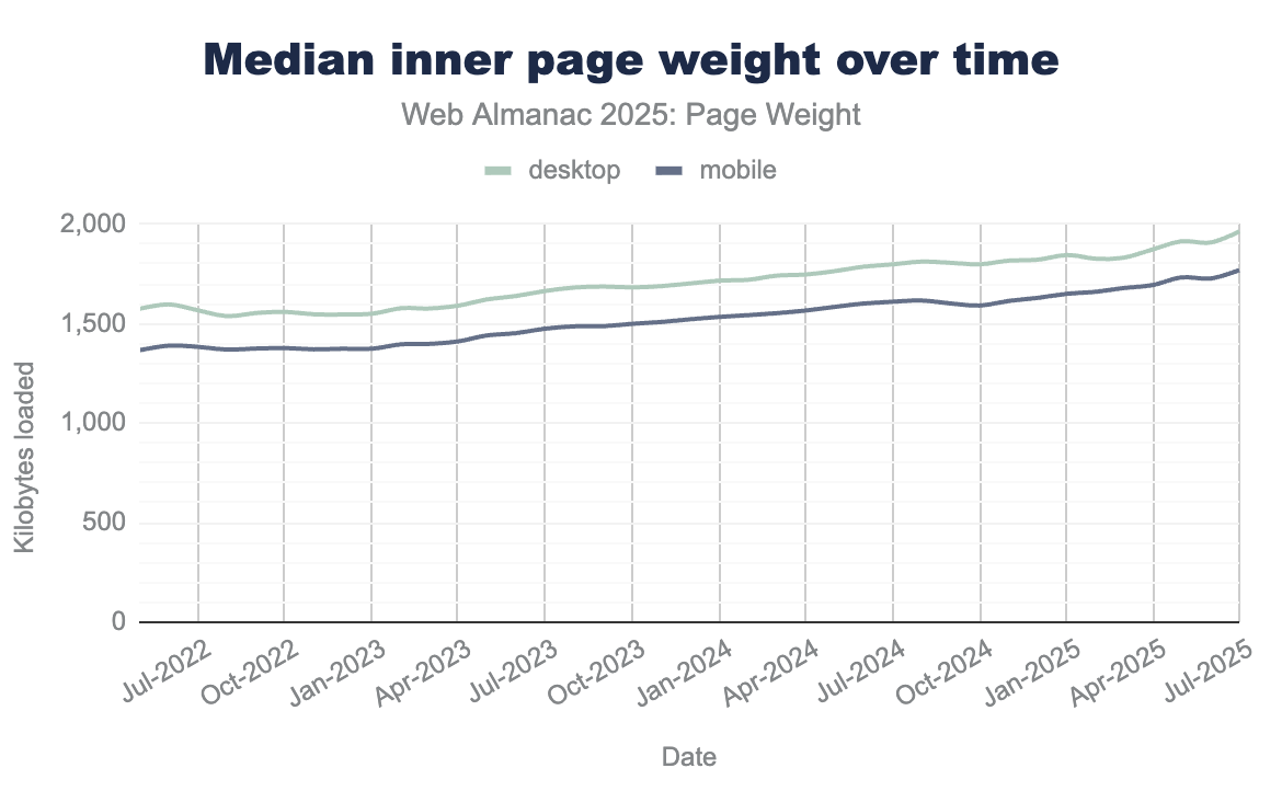 According to Httparchive data from last year, the average desktop homepage contained 22 KB of HTML source. This means our pages would need to be nearly 90 times heavier to hit Google’s new limit; however, it is also a reality that page weights generally increase year over year: