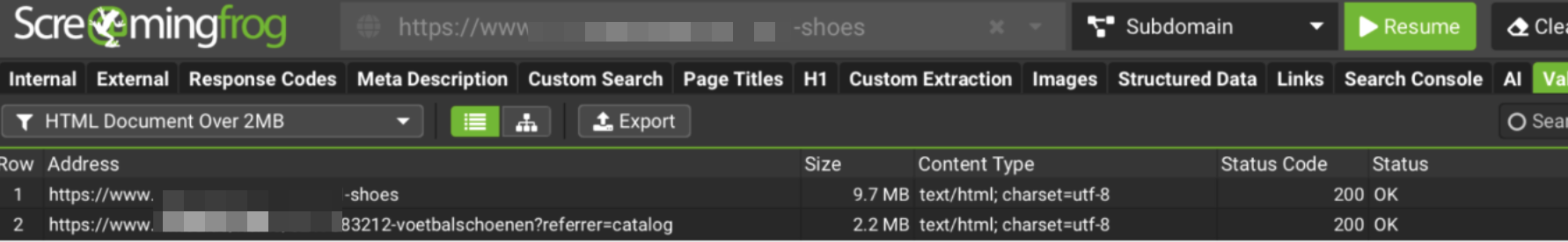 - Finally, you can check the crawl results from the “HTML Document Over 2MB” section under Validation in Screaming Frog: