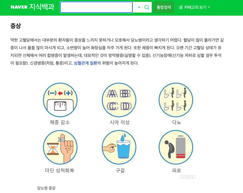 Naver can be defined as a portal in South Korea where content is produced and consumed within itself, rather than just a search engine. You can review Naver Blog, Naver Cafe, and Naver Terms content beforehand. The example below contains encyclopedic information about Diabetes. If you are a hospital engaged in health tourism and your target is South Korea, your content must be optimized to be competitive and include local terms: