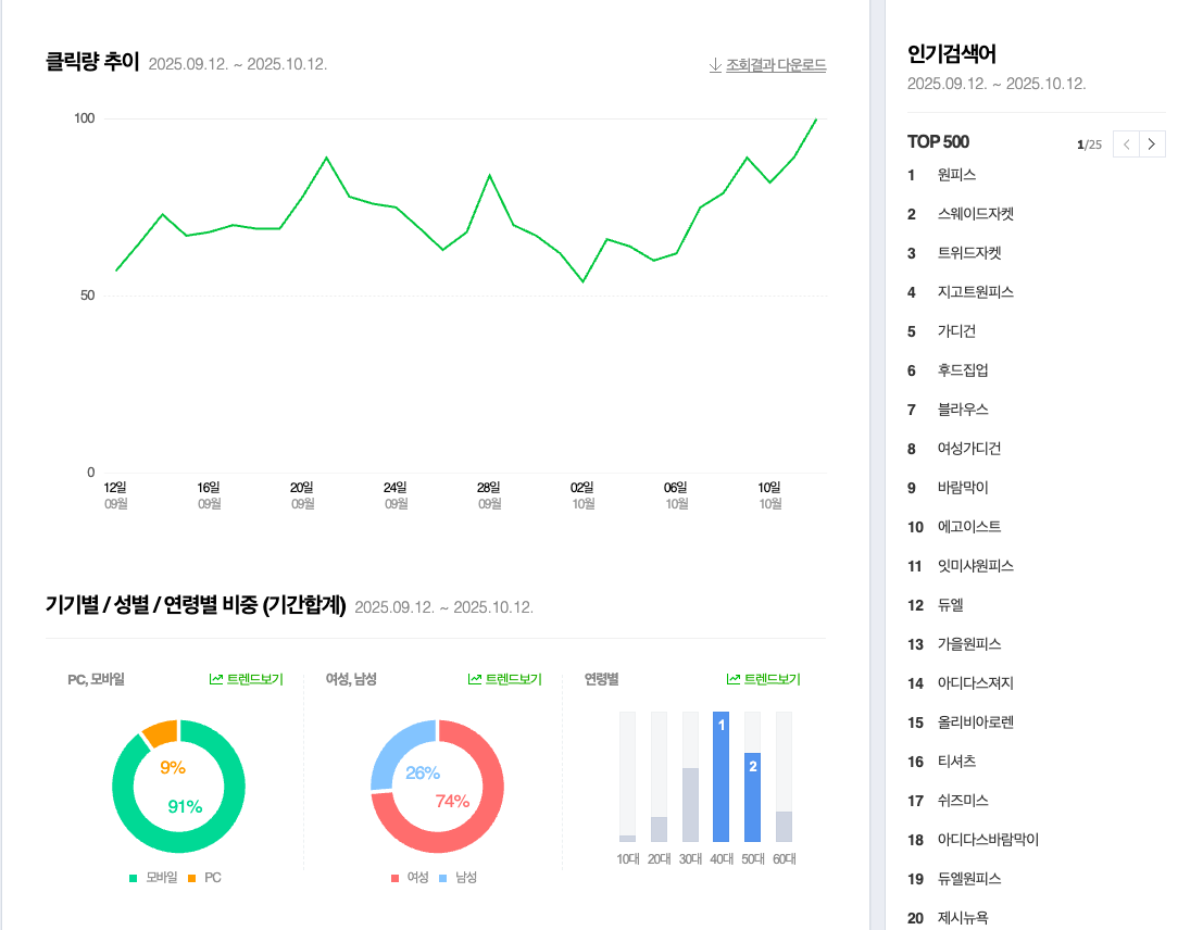 The platforms used by a user in China are completely different from those used by users in South Korea. Therefore, instead of seeing Asia as a single market, it is necessary to know that there are many different sub-segments within it. In addition to the SEO tools we constantly use, you can use Naver DataLab for research in South Korea. In the example below, you can see data such as click volume trend, device, gender, and age distribution, and you can conduct more detailed research if you wish:
