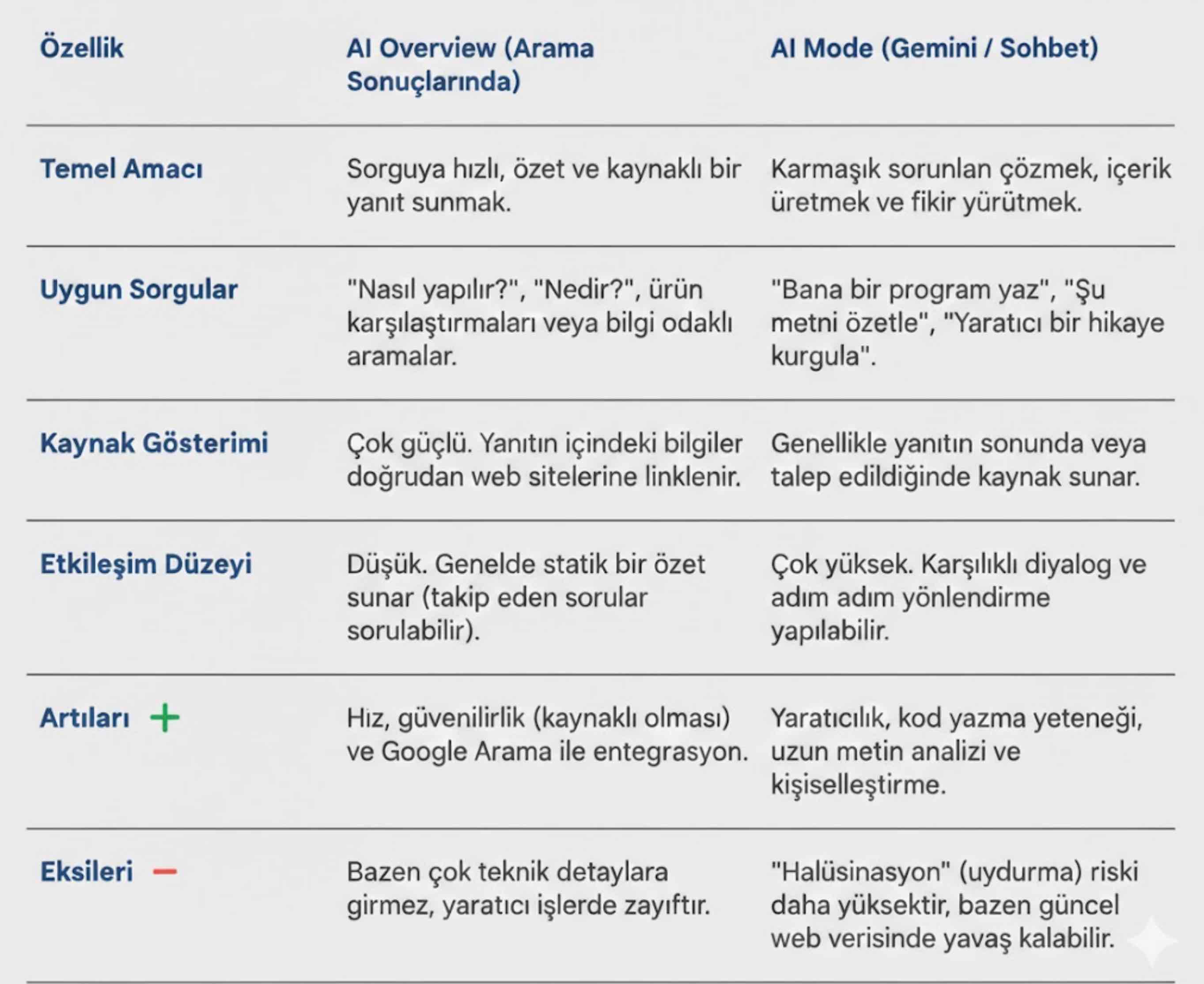 Aşağıda AI Mode ve AI Overview’a yönelik kıyaslama tablosunu görebilirsiniz.