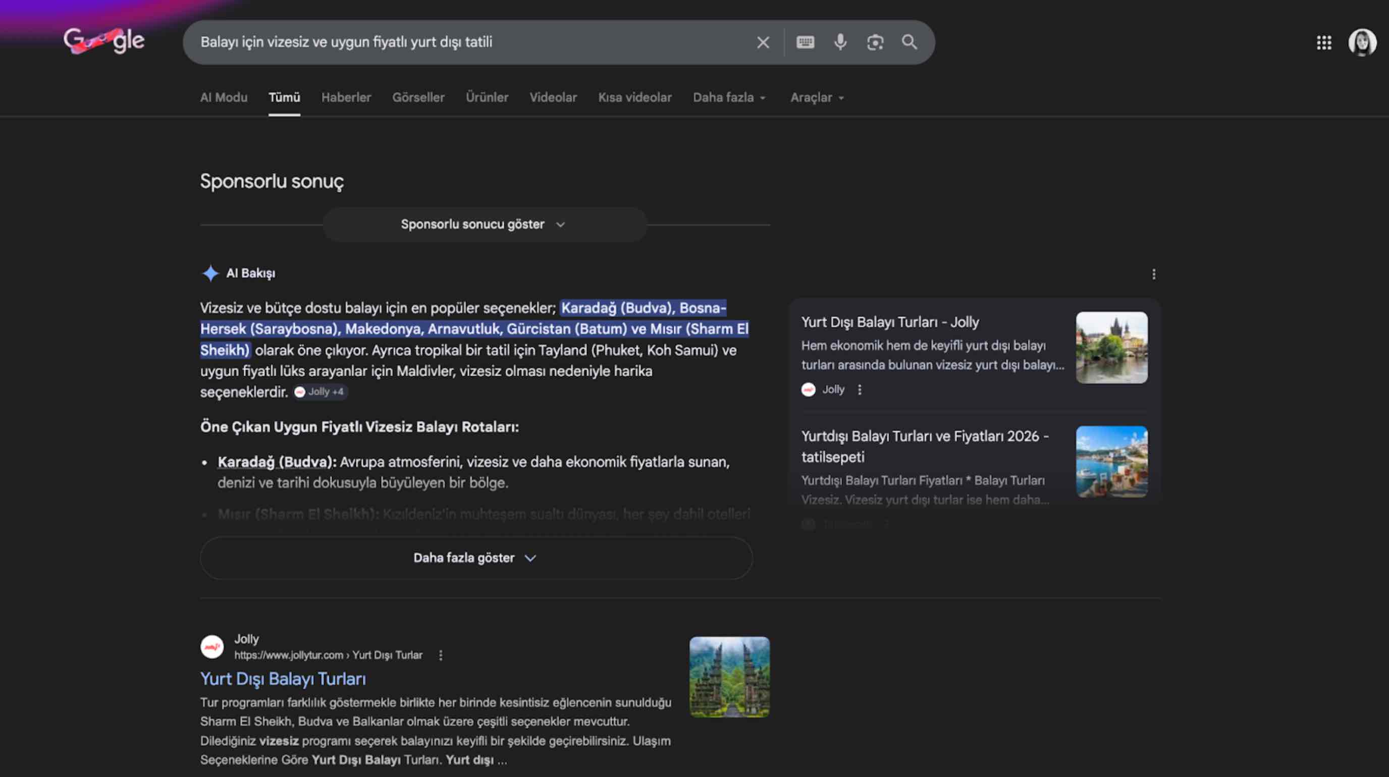 Örneğin, AI Mode’da balayı için vizesiz ve uygun fiyatlı yurt dışı tatili önerileri aradığınızda doğrudan öneriler ile karşılaşırsınız. Bu da klasik arama görünümüne göre daha iyi bir deneyim sunar.