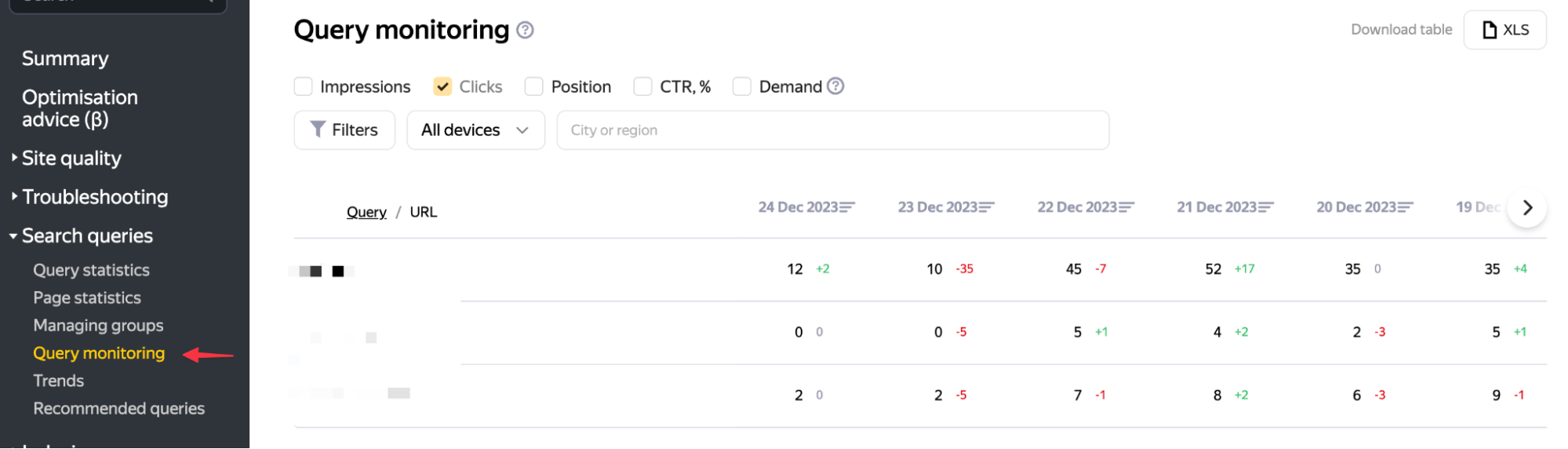 Sadece Yandex’e özel rank tracker bulmak bazen zor olabiliyor. Aşağıdaki kısımdan kelimeleri takip edebilir ve istediğiniz tüm filtreleri tablo üzerinde uygulayabilirsiniz:
